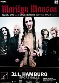 Guns, God and Government was a worldwide arena tour by American rock band Marilyn Manson. It was the eighth tour the band embarked upon and the fourth to span over multiple legs. It was launched 17 days ahead in support of their fourth full-length studio album, Holy Wood (In the Shadow of the Valley of Death), which was released on November 14, 2000, in the US and Australia.[1][2] Beginning on October 27, 2000, and lasting until September 2, 2001, the tour included six legs spanning Eurasia, Japan and North America with a total of 107 completed shows out of 109 planned.[1]