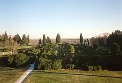 The garden is located behind the house, or on the southern side. The garden was grown above a man-made level platform where there used to be a hill, and is exactly one acre (about 4000 sq m) in area. A gravel path runs from the back of the house to the southern edge, and was twelve feet (3.7 m) wide during Mason's time period, the same width as the central passage in the house and the portico. Today, the path is narrower, crowded by boxwoods that are now about 250 years old. The path ends in an overlook extending out from the steep edge of the garden. From here, the Potomac river can be seen. The Gunston Hall museum website says that the view was more impressive during Mason's time, when the trees were cleared. The garden was most likely broken into four rectangles, with additional gravel paths running through and around it. To give the illusion from the house of all rectangles being the same size, the rectangles closer to the house were probably shorter than the rectangles farther away.[35]