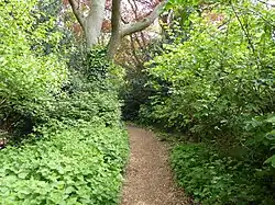 This was formerly part of the gardens of Gunton Old Hall, which was demolished in 1963. There are trees such as lime, oak and copper beech, a pond and green winged and bee orchids.[1][3]