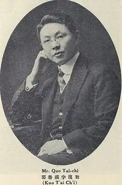 Guo Taiqi (Chinese: 郭泰祺; pinyin: Guō Tàiqí; Wade–Giles: Kuo T'ai-ch'i, also Quo Tai-chi; 1888–1952) was a diplomat during the Republic of China and an active member of the Kuomintang from the early years of the Republic of China until shortly after the Chinese Communist Revolution on mainland China.