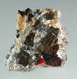 Gurimite is a rare mineral with formula Ba3(VO4)2.[2][3] It is a simple barium vanadate, one of the most simple barium minerals known.[3] It is named after its type locality - Gurim anticline in Israel. It has formed in the rocks of the Hatrurim Formation.[2] Gurimite's stoichiometry is similar to that of copper vanadates mcbirneyite and pseudolyonsite.[4][5] An example of other barium vanadate mineral is tokyoite.[6]