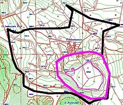 Gurio Lamanna (also incorrectly called Gurlamanna) is a doline shaped like a coat of arms located in the Murge plateau and falling into Gravina in Puglia's territory, on the border with Altamura, Apulia, southern Italy. It is "one of the largest karst landforms of the Murge plateau"[2] and it is located very close to other two dolines, namely Pulicchio di Gravina and Tre Paduli. Depending on the type of geomorphologic classification employed and the author who suggested it, the karst landform can be defined either a doline or a "karst basin" (Italian: bacino carsico). It is traditionally called "karst basin", following the suggestion of Carmelo Colamonico, who first studied the doline and saw in its large size and shallow depth a good reason to distinguish it from a normal doline.[3] The definition of "karst basin", used by Carmelo Colamonico, has been introduced by Renato Biasutti.[4][5] Carmelo Colamonico stated that Gurio Lamanna is "one of the best examples of karst basin in the Murge plateau".[3]