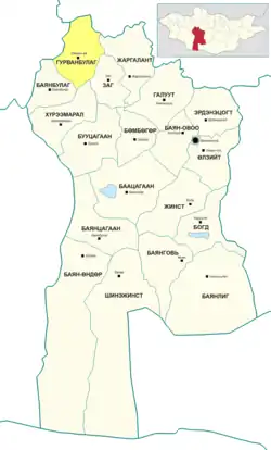 Gurvanbulag (Mongolian: Гурванбулаг, Three Springs) is a sum (district) of Bayankhongor Province in southern Mongolia. In 2006, its population was 2,594.[1]