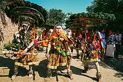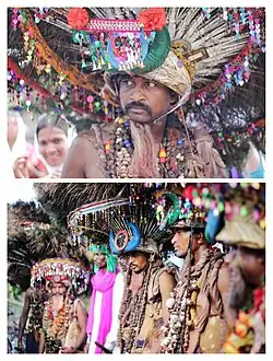 The Dandari festival starts with the day of "Bhogi" by worshipping Aethmasur pen and instruments used in Gussadi dance like Parra, Vette, Kodal etc..and ends with the day of "Kolabodi". During this period, dandari troupes consisting of men and women travel from one village to another performing gussadi and other traditional dances. The dancers wear powerful dresses and ornaments, including turbans decorated with peacock feathers, deer horns, artificial moustaches and beards as well as saffron and yellow coloured dresses. They also wear garlands and straps on their legs and waist, carrying the crew as they dance in rhythm to tribal instruments. .[3]