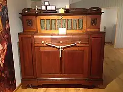 The museum houses several exhibits, like a player piano made by Welte-Mignon, which reproduces the composition accurately in the way Mahler intended it to sound. Reproductions of placards on an advertising column announce concerts of his work.[2] Leaning against the column a black bicycle from 1895 can be seen with handgrips of cork and an oil lamp. Mahler learned traveling by bike in Hamburg[2] and became a passionate cyclist.[3]