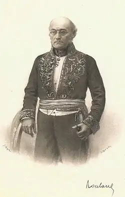 Rouland encouraged the study of local history, philology and archaeology at the Comité des travaux historiques (CTH) and created a scientific section.[17] In the spring of 1859 he issued a circular on undertaking an archaeological inventory of France.[18] In 1862, at the opening the Palair des facultés in Nancy, Rouland said his audience should be inspired by "the traditions that live upon this land of Lorraine, and which France, our common patrie, accepts and glorifies."[19] He initiated the annual Congrès des sociétés savantes in 1861, where officials of his ministry could mingle with leaders of the scientific world.[20] After leaving office Rouland was appointed a member of the Superior Council of Public Instruction on 7 November 1863. In 1867 he said that prefects should have the right to select teachers, saying "the teacher should be a friend of public order, the friend of the government."[3]