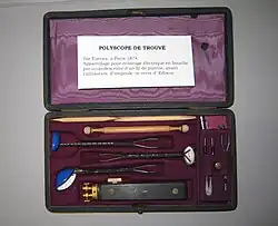 Trouvé took part in the improvement of communication systems with several noteworthy innovations. In 1870, he developed a device for locating metal objects such as bullets in human patients.[7] It used electric conduction, but unlike the one made by Professor Favre in 1862, Trouvé's buzzer made distinct sounds for lead and iron.[8] In 1872 he developed a portable military telegraph whose cabling enabled rapid communication up to a distance of one kilometer, enabling the swift transmission of both orders and reports back from the Front.[9] In 1878, he improved the sound intensity of Alexander Graham Bell’s telephone system by incorporating a double membrane. The same year he invented a highly sensitive portable microphone. Trouvé soon came to be known and respected for his talent for miniaturization. The same year, using a battery developed by Gaston Planté, and a small incandescent airtight bulb, he innovated a "polyscope", the prototype of the modern endoscope.[10]