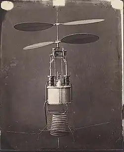 He successfully invented one of the first prototypes of a helicopter by designing his "dear propeller" in 1861, with his friend Gabriel de La Landelle, an experimental small prototype of a "heavier-than-air" aerostat with counter-rotating rotor with two coaxial aerial propellers, and a bicarbonate steam engine[4][5] (whose boiler was one of the first uses of aluminum), inspired, among other things, by the aerial screw and the ornithopter from Leonardo da Vinci's manuscripts of the 1480s, the Chinese bamboo-copter of the 4th century,[6] and their early study prototypes of aerial propeller, the "spiralifers".[7]