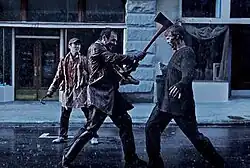 ![]() While the rain washes away the camouflage of human blood and guts, Rick dispatches an attacking walker as Glenn Rhee watches. | |