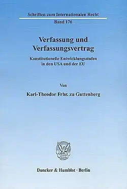 Guttenberg studied law at the University of Bayreuth,[20] where he passed the first legal state examination in 1999. In 2007, he was awarded a doctoral degree in law, under the supervision of Peter Häberle, with a dissertation on the development of constitutional law in the United States and the European Union. The doctoral dissertation was titled Verfassung und Verfassungsvertrag. Konstitutionelle Entwicklungsstufen in den USA und der EU (lit. 'Constitution and Constitutional Treaties. Constitutional Steps of Development in the USA and the EU'), and was graded by the university with summa cum laude.