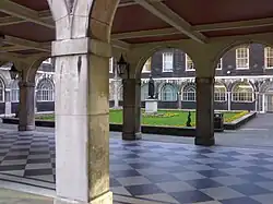 The Colonnade is also part of the original Guy's Hospital. It was built with two courtyards on either side.[2] A round-hooded Portland stone alcove with a figure sitting inside is located at the eastern courtyard of the Colonnade. The alcove was originally part of, and is one of the surviving fragments of the old London Bridge that was demolished in 1831.[2][3] The alcove was brought to the hospital in 1861, and was re-erected within the eastern internal court in 1926.[3] The alcove now houses the statue of John Keats, an English Romantic poet who studied at Guy's Hospital from 1815 to 1816 to become an apothecary. The statue displayed at the western courtyard on the other side of the Colonnade is that of William Morris, 1st Viscount Nuffield, another benefactor of Guy's Hospital.[2] The front courtyard, named the General Court, was later built in 1738,[3] and the part of the Georgian complex was completed in 1780.[5] A brass statue of Thomas Guy by Peter Scheemakers stands in the centre of the General Court,[2][6] upon a pedestal with bas-reliefs of "Christ Healing the Sick" and the "Good Samaritan".[4][6]