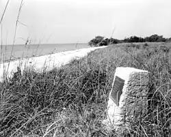 Bradley was buried on a shell ridge at Cape Sable, overlooking Florida Bay. A nearby monument was erected by the Florida Audubon Society, reading: "Guy M. Bradley, 1870–1905, Faithful Unto Death, As Game Warden of Monroe County He Gave his Life for the Cause to Which He Was Pledged".[43] The grave and monument, however, were later washed away in 1960's Hurricane Donna.[44] The original gravestone was recovered, and is now on display at the Flamingo Visitor Center. A nearby plaque was also dedicated to Bradley's memory, and reads: "Audubon warden was shot and killed off this shore by outlaw feather hunters, July 8, 1905. His martyrdom created nationwide indignation, strengthened bird protection laws and helped bring Everglades National Park into being."[45]