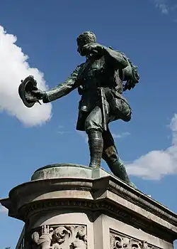 Despite his disappointing degree result, Burgess returned to Cambridge in October 1933 as a postgraduate student and teaching assistant. His chosen research area was "Bourgeois Revolution in Seventeenth-Century England", but much of his time was devoted to political activism. That winter he formally joined the British Communist Party and became a member of its cell within CUSS.[44] On 11 November 1933 he joined a mass demonstration against the perceived militarism of the city's Armistice Day celebrations. The protestors' objective, laying a wreath bearing a pacifist message at the Cambridge War Memorial, was achieved, despite attacks and counter-demonstrations which included what the historian Martin Garrett describes as "a hail of pro-war eggs and tomatoes".[45][46] Alongside Burgess was Donald Maclean, a languages student from Trinity Hall and an active CUSS member.[47] In February 1934 Burgess, Maclean and fellow members of CUSS welcomed the Tyneside and Tees-side contingents of that month's National Hunger March, as they passed through Cambridge on their way to London.[48][47][49]