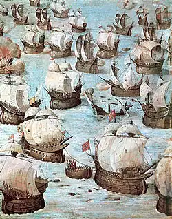 During the sixth French War of Religion in 1577 the town of Brouage near La Rochelle became a subject of the campaign. Brouage combined a most significant tactical position and was also the regional capital for salt production making it a rich target.[70] The town was held by the Protestant rebels, with the prince de Condé inspecting the town and its surrounds in early June so as to assess their defences. On 22 June it was put to siege from land by the royal army under the duc de Mayenne and from sea by the seigneur de Lanssac who was in command of eighteen ships.[71][47] Those inside Brouage looked to La Rochelle and the Île d'Oléron for support, but found none forthcoming. Four days after the siege had begun, the prince de Condé attempted to force his ships into the harbour of Brouage, but a storm threw him back. He then made a new attempt on 9 July, but this time it was forces under the seigneur de Lanssac that frustrated his designs. A new attack was made to break into the harbour on 11 July which was similarly unsuccessful. Not long thereafter (on 16 July), the maréchal de Monluc brought five galleys to reinforce the royalist stranglehold on Brouage. This force successfully unified with the ships under Lanssac's command at the harbour.[72]