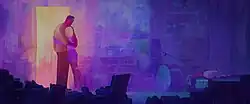 Gwen's home dimension of Earth-65 is featured in Across the Spider-Verse. Described by the filmmakers as a "mood ring" reflecting Gwen's emotions, the world's colors and transitions are "not literal", with its details dependent on Gwen's feelings.[10] Carlos Aguilar of the New York Times wrote that "for example, if [Gwen] feels angry, the screen turns red and the atmosphere hotter. And when confusion overtakes her, the world becomes fragmented".[53] Thompson cited Cinderella, the 1950 Disney film, as serving as a reference in this regard.[53] The visual effect results in "watercolor-like hues that drip and morph in reaction to Gwen".[10] Gwen's world in the film is inspired by elements of Rodriguez's artwork and Renzi's colors from the original Spider-Gwen run.[14][49] The Spider-Verse filmmakers wanted Gwen's motions to resemble a gymnast's, with animator Spencer Wan pitching to make her swinging animations incorporate banned gymnastics moves.[54][55]