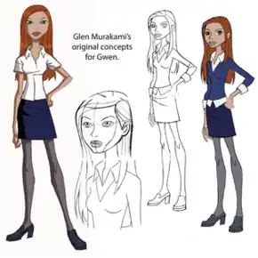 Gwen's original design, including a yellow t-shirt and ponytail, was inspired by the original design of Ben Tennyson, the red hair retained for all series, while the ponytail would be incorporated into her outfit redesign by Glen Murakami for the last season of Alien Force, the entirety of Ultimate Alien and the first season of Omniverse.[11] Her head and hair were reworked by Glenn Wong, who also gave the character her blue top in Alien Force, while colors were added by Chris Hooten.[12]