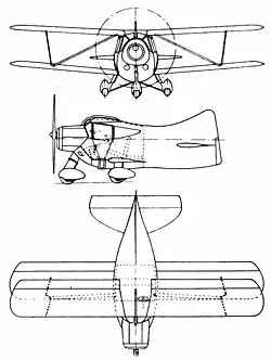 The tricycle undercarriage, unusual at the time, had short main legs made possible by the combination of lower fuselage depth and hence lower wing position, together with the offset propeller. These legs were joined to the front wing spar close to the fuselage, cross braced and splayed outwards to increase the track. The front leg, mounted just behind the engine, was much longer; all three legs were faired and carried wheels enclosed in spats.[1][2]