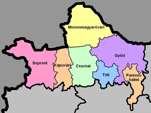 Győr–Moson–Sopron (Hungarian: Győr-Moson-Sopron vármegye, pronounced [ˈɟøːr ˈmoʃon ˈʃopron ˈvaːrmɛɟɛ]; German: Komitat Raab-Wieselburg-Ödenburg; Slovak: Rábsko-mošonsko-šopronská župa) is an administrative county (comitatus or vármegye) in north-western Hungary, on the border with Slovakia (Bratislava region, Nitra region and Trnava region) and Austria (Burgenland). It shares borders with the Hungarian counties Komárom–Esztergom, Veszprém and Vas. The capital of Győr–Moson–Sopron county is Győr. The county is a part of the Centrope project.