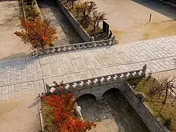 A kŭmch'ŏn'gyo (bridge over a kŭmch'ŏn) to the north of Gwanghwamun. It passes over the stream Myeongdangsu and is made of stone.[122] Passing the bridge was seen as ceremonially entering the inner sanctum of the palace.[123] It was likely completed in 1395.[122] It was named in 1426.[124] In 1916, during the construction of the Government-General of Chōsen Building,[125] Yeongjegyo was disassembled and its remains moved to the west of the Government-General Museum of Chōsen. In the 1950s, it was installed in front of Sujeongjeon. It was again moved to the west of Geonchunmun in the 1970s.[126] It was restored to its original location in 1996,[127] 1997,[128] or 2001.[122] It is around 10 m (33 ft) wide and 13 m (43 ft) long.[126] |