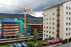 In the 1950s, Gyldenpris became more densely settled because of the limited supply of building land within Bergen's city limits. The solution to the housing shortage at that time was to build higher. In 1951, the Vestbo housing company built three typical seven-story tower blocks operated by Stranden Boliglag AS (75 units). Later larger apartment blocks were built. The Münsterbekken Housing Cooperative (274 units) was built by Arne Sande AS in 1978, and housing became denser in 1980, when the BOB company built 72 units in the Gyldenpris Housing Cooperative. The most recent major expansion took place in 2004, when the Student Welfare Organization in Bergen built an apartment building with 157 units[10][11] in the area between the former Høyes winery building and the Gyldenpris soccer field.