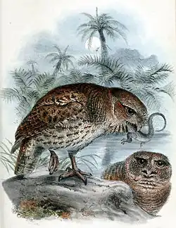 A species endemic to the Virgin Islands was described in 1860 by George Newbold Lawrence under the binomial Gymnoglaux newtoni.[12] This is treated as a subspecies of the Puerto Rican owl (Gymnasio nudipes newtoni), but its identity as a separate subspecies has been questioned because it is based on minor differences in plumage. The taxon is probably extinct as surveys of the Virgin Islands conducted since 1995 have failed to detect any Puerto Rican owls.[13][14][5]