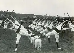 This situation, which irritates anticlericals,[9] is not without risks.[T 2] In September 1904, Father Deschamps' troops escorted Émile Combes, President of the Council, to the Auxerre train station with fanfare,[P 4] causing annoyance. However, on June 8, 1907, the Saint-Joseph des Épinettes event resulted in one fatality and two serious injuries.[J 5] The competition in Roubaix on July 11, 1911, attracted 50,000 spectators and 8,000 gymnasts, but also faced opposition from 3,000 anti-clerical protesters, requiring 400 gendarmes to be reinforced by two squadrons of dragoons and two police brigades.[M 4] It was a war period, and the situation persisted because three weeks before the declaration of the Great War, on July 12, 1914, in Roanne, an enthusiastic prefect mobilized the army and had a parade charged by the mobile guard on the pretext that priests accompanied it.[10] Nevertheless, alliances are multiplying, especially in the provinces, and on October 8, 1910, in Chantilly, a society from Bordeaux, La Flèche, won the first federal gymnastics championship.[J 6] The following year, 43 regional unions and 1,250 affiliated societies participated in the 9th federal congress.[H 3]