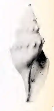 The spire of the rather solid shell is composed of 9 whorls, separated by a well marked suture. The whorls of the protoconch consist of curved longitudinal ribs and are, at the bottom, finely reticulated. A little below the middle of the subsequent whorls, occur a series of longitudinal, tuberculous plicae. These tubercles are protruding, rounded, very regularly arranged and give the whorls a streamlined appearance. There are 15 plicae on the penultimate whorl, 20 on the body whorl These plicae do not extend to the suture. On the body whorl however, they continue downward in an obsolete manner. The infra-sutural zone, is wide, sloping, with very arched growth lines, a little more developed close to the suture. The whole surface, with the exception of the infra-sutural zone, is crossed by small, thin, and regular growth lines, a little less wide than their intervals. The aperture is elongated, angular at the apex, attenuated at the base where it is prolonged into a mediocre, well open and not reflected siphonal canal. The columella is very slightly twisted. The outer lip is simple, arched and is broadly, but not deeply indented at the top.[2]