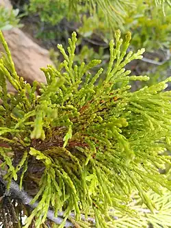 Gymnosporangium libocedri, the Pacific Coast pear rust, is a plant pathogen and rust fungus.[1] It produces orange gelatinous growths (telia) on incense cedar in the spring. Its secondary hosts include apple, crabapple, hawthorn, mountain ash, pear, quince, and serviceberry.