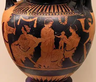Free-born male citizens held political, social and economic power within the domestic and public sphere, as evidenced by the vast amount of historical records available regarding inheritance, property rights, and trade agreements.[6] Ancient law books and surviving artwork reveal inheritance and property rights favoring male kin and even male non-kin over the women of the household. The practice of exposing new born female babies revealed a society that favored the male sex.[6] The creation of specific rooms in the house designated for male-only socialization appeared at a certain point in the Classical Greek period. The practice of holding symposium, within the andrōn for the possible purpose of arranging economic agreements within the male aristocratic community, is alluded to in many ceramic vases and murals.[7] It is in sifting through these surviving remnants of the domestic sphere that archeologists have been able to piece together an understanding of women's social, economic, and political realities.