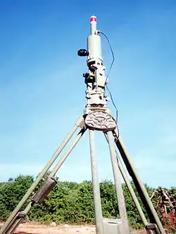 A gyroscope is mounted in a sphere, lined with Mu-metal to reduce magnetic influence, connected by a spindle to the vertical axis of the theodolite. The battery-powered gyro wheel is rotated at 20,000 rpm or more, until it acts as a north-seeking gyroscope.[2] A separate optical system within the attachment permits the operator to rotate the theodolite and thereby bring a zero mark on the attachment into coincidence with the gyroscope spin axis. By tracking the spin axis as it oscillates about the meridian, a record of the azimuth of a series of the extreme stationary points of that oscillation may be determined by reading the theodolite azimuth circle. A midpoint can later be computed from these records that represents a refined estimate of the meridian. Careful setup and repeated observations can give an estimate that is within about 10 arc seconds of the true meridian.[5] This estimate of the meridian contains errors due to the zero torque of the suspension not being aligned precisely with the true meridian and to measurement errors of the slightly damped extremes of oscillation. These errors can be moderated by refining the initial estimate of the meridian to within a few arc minutes and correctly aligning the zero torque of the suspension.[6]