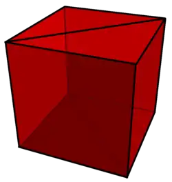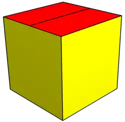 The dual polyhedron of the gyrobifastigium is combinatorially equivalent to a cube with two of its opposite faces subdivided into triangles by diagonals that are not parallel to each other.[9] A combinatorially equivalent form of the elongated gyrobifastigium, a related space-filling polyhedron, can be obtained by instead subdividing two opposite faces into rectangles by midlines, again choosing the subdivision lines to be non-parallel.