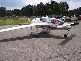 The Gyroflug SC 01 Speed Canard is an unconventional sports plane produced in Germany in the 1980s and 1990s. Inspired by the Rutan VariEze, the Speed Canard was an all-new design created without input from Rutan. Like the VariEze, the Speed Canard is a canard-configured mid-wing monoplane with wingtip fins that incorporate rudders. The two-seat tandem cockpit and canopy design were derived from Grob Twin Astir sailplane, and the nosewheel of the tricycle undercarriage is retractable. Construction throughout is of composite materials, and when the design attained German certification in 1983, it became the first composite canard design to achieve certification anywhere in the world. An interesting feature of the control system is that the twin rudders operate independently, allowing both rudders to be deflected outwards simultaneously, cancelling each other's yaw, but acting as airbrakes.