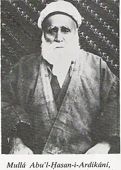 Mullá Abu'l-Hasan-i-Ardikání (Persian: ملا أبو الحسن أرديكاني, surnamed Amín-i-Iláhí; 1831 – 1928), better known as Hájí Amín, was an eminent follower of Baháʼu'lláh, founder of the Baháʼí Faith. Amín served as the trustee of Huqúqu'lláh, was posthumously appointed a Hand of the Cause of God by Shoghi Effendi, and identified as one of the nineteen Apostles of Baháʼu'lláh.