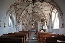 The church is richly decorated with murals from two different time periods. In the apse there are Romanesque murals from the second half of the 13th century, depicting Christ in Majesty surrounded by the symbols of the Four Evangelists. Underneath, the Apostles are depicted in a row. The other set of paintings decorate the vaults in the nave of the church. They are Gothic in style and depict religious scenes from the Bible. They were made some time before 1487, since the coat of arms of two Danish noble families (the province of Skåne was at the time Danish) from Jutland who are known to have owned estates in the area previous to that date decorate the walls. Very probably it was these two families who commissioned the painting of the murals.[1]