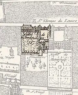 The Hôtel de Rambouillet[2] (French pronunciation: [otɛl də ʁɑ̃bujɛ]), formerly the Hôtel de Pisani ([otɛl də pizani]), was the Paris residence of Catherine de Vivonne, marquise de Rambouillet, who ran a renowned literary salon there from 1620 until 1648.[3] It was situated on the west side of the rue Saint-Thomas-du-Louvre, just north of Marie de Rohan's Hôtel de Chevreuse, in a former quarter of Paris (demolished during the 19th century), located between the Louvre and Tuileries palaces, near the then much smaller Place du Carrousel,[1] in the area of what was to become the Pavillon Turgot of the Louvre Museum.