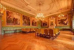 The design involved a symmetrical main frontage of nine bays facing onto the central square (now Place d'Armes). The central bay, which was slightly projected forward, featured a segmental headed doorway framed by two pairs of Doric order columns supporting a balustraded balcony; there was a French door on the first floor. The other bays were fenestrated by segmental headed windows on both floors. There building also had an attic level, which was recessed and fenestrated with a series of Diocletian windows. There was a steep roof and a small clock tower rising from the front of the building, above the central bay. Internally, the principal rooms were Salle du Conseil (council chamber), now known as the Kléber room, on the ground floor, and the Salle d'Honneur (room of honour), which was created in 1810, on the first floor.[10] The Salle d'Honneur was decorated with five paintings which depicted major events in the history of the town.[11]