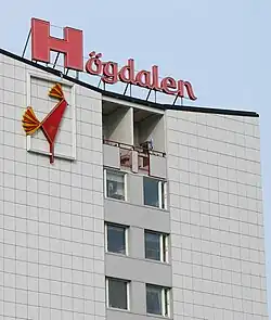 Notable landmarks in Högdalen are the neon rooster on top of an apartment block in the commercial area, and the golden rooster on top of the local church.