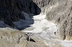 The Höllentalferner is a glacier in the western Wetterstein Mountains. It is a cirque glacier that covers the upper part of the Höllental valley and its location in a rocky bowl between the Riffelwandspitzen and Germany's highest mountain, the Zugspitze, means that it is well-protected from direct sunshine.