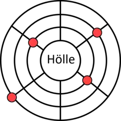 For the game of Hölle four concentric circles are chalked on the table with a line radiating from the centre to each player who has a counter or other object which may be moved backwards and forwards along the line. Players are dealt one card each which they look at and, if they think they can exchange it for a higher one, may ask for another card. At a signal from the game 'leader' they face their cards and the one with the lowest card (Aces being low) moves one place nearer the "hellhole" i.e. moves a counter onto the outermost circle. The cards are redealt and play continues in this way until all bar one player reaches the centre, whereupon that remaining player is the winner.