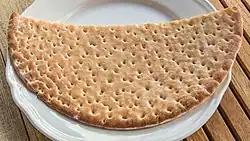 Hönökaka (English: Hönö bread or Hönö cake) is a type of Swedish flat soft white pricked bread. It is named after the island town Hönö in Gothenburg's northern archipelago, and was originally baked by the people living on said archipelago's different islands. The bread is baked in round flat pieces, but is usually sold as half-circles. In 2014, industrially made hönökaka was produced by two manufactures, Åkes Äkta Hönökakor and Pågen.[1]