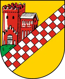 The coat of arms of the Stadtbezirk shows the Hörder Burg (Hörde Castle), overlaid with a red-and-white chequered band that was used as the sign of the Counts of Mark. The semicircle is originally green and represents a meadow. The background is golden.