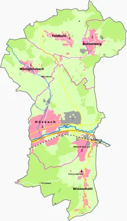 Hösbach has ten Ortsteile located on five Gemarkungen (traditional cadastral areas). These are as follows (population numbers for 2011):[3][4]