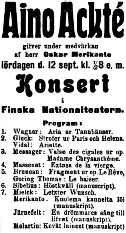 "Höstkväll" (literal English translation: "Autumn Evening"),[b] Op. 38/1,[c] is an art song for vocal soloist (typically soprano) and piano written in 1903 by the Finnish composer Jean Sibelius. The piece, which is a setting of the eponymous poem by the Swedish poet Viktor Rydberg,[d] premiered on 12 September 1903 at the Finnish National Theatre in Helsinki, with the Finnish soprano Aino Ackté as soloist accompanied by the Finnish composer Oskar Merikanto on piano.[1]