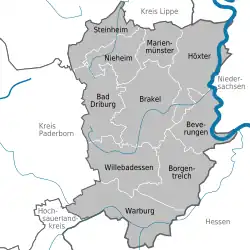 The present district was created in 1975 when the former districts Warburg and Höxter were merged. At the same time the towns and municipalities in the district were merged to form the today's ten towns.