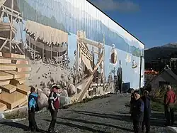 The Høylandsbygd shipping mural is a wall mural located in Høylandsbygd in Kvinnherad. It is the biggest painted mural in the world, with the larger of the two painted walls being 80 metres long and 16 metres tall. The total area of both paintings is 1,500 m2.[1][2][3]