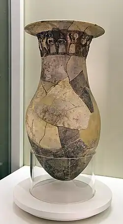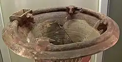 Hittite relief vases have been known since the excavations of Boğazköy (the Hittite capital of Hattusa). Fragments have also been found at Alişar, Alaca Höyük, Eskiyapar, Kabaklı, Elbistan-Karahöyük und Kaman-Kalehöyük. They have generally been dated to the early period of the Hittite Empire, in the first quarter of the second millennium BC. The sole reconstructed example was a four frieze vase from İnandıktepe, which is on display in the Museum of Anatolian Civilizations in Ankara, and a fragment with three friezes from Bitik. The motifs depicted on these vases consist of ritual activities, offering scenes, and festivals with acrobats, dancers and musicians.[4]