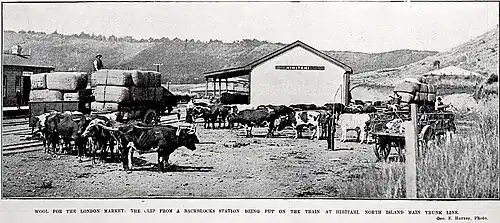 A service road to help with building the railway was formed in 1887,[10] when the route was first surveyed.[12] The Public Works Department (PWD) had the rail and telegraph lines through Hīhītahi[11] built by 1906.[13] NZR took it over as a flag station on 1 July 1908, when the railhead from the south was extended from Mataroa to Waiouru.[14]