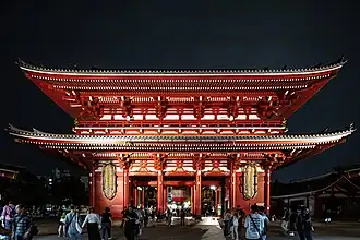 The Hōzōmon (宝蔵門, "Treasure-House Gate") is the inner of two large entrance gates that ultimately leads to the Sensō-ji (the outer being the Kaminarimon) in Asakusa, Tokyo. A two-story gate (nijūmon), the Hōzōmon's second story houses many of the Sensō-ji's treasures. The first story houses two statues, three lanterns and two large sandals. It stands 22.7 metres (74 ft) tall, 21 metres (69 ft) wide, and 8 metres (26 ft) deep.[1]