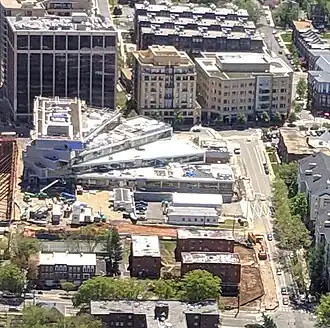 In 2014, the Arlington School Board identified a need for additional middle school capacity in the north-central area of the county. After contentious public debate over various options, it was determined that the Stratford building was the best location for a new middle school, and another location would be chosen for H-B Woodlawn. On December 18, 2014 the School Board voted to construct a new building for H-B Woodlawn in the Rosslyn neighborhood of Arlington, Virginia, on property that was formerly home to Wilson School and Rosslyn Highlands Park.[7] The Wilson School was demolished in 2017, and construction began on the new building at 1601 Wilson Blvd. (See side panel for full address). The new building was mostly completed and ready for use in late summer 2019. It featured 7 levels (basement, ground, 1–5), of which the basement and ground floors are underground, with the rest in a fanning shape above ground.[8] Schooling began in the new building in the 2019–2020 school year, starting September 3, 2019, with some students happy about the change and others not.[9][10] The building was completed at a cost of $100 million.[11][12][13]