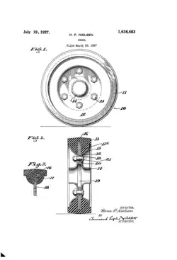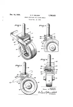 In 1927, Nielsen patented an improved caster wheel to solve the problem of tire creep and side flex under heavy load: US Patent 1636483.His wheel structure included disks clamped to either side of the wheel, and a webbed fabric structure integrated into the rubber of the tire. In the same year, Nielsen filed a patent for Wheel Structures comprising a swivel caster with ball bearings. He refiled in 1930, and was granted US Patent 1749502. The same year he filed and was issued a patent for a caster wheel brake structure, US Patent 1785421.